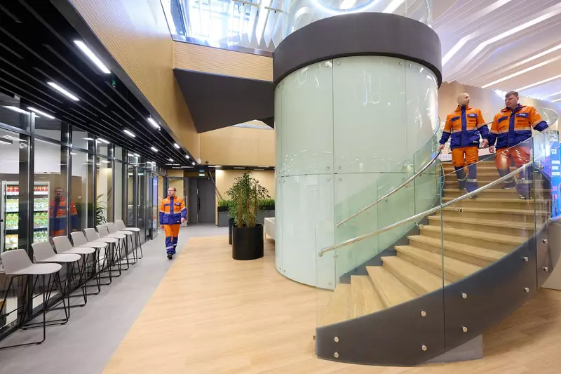 В комплексе предусмотрены индивидуальные жилые модули, оснащенные системой «умный дом», климат-контролем и биодинамическим освещением⃰, имитирующим естественный световой цикл для полноценного отдыха. В центральной части комплекса расположен атриум — открытое пространство с потолками высотой 12 метров. Здесь находятся кофе-зоны и озелененные пространства для отдыха и общения. Для индивидуальной и командной работы предусмотрены конференц-залы, кабинеты и переговорные.Вахтовый комплекс построен по каркасной технологии — здание собрано из доставленных в автономию готовых элементов, что сократило площадь застройки и сроки монтажа. В комплексе применены передовые решения, обеспечивающие максимальную экологичность здания и его высокую энергоэффективность. С учетом длинных сибирских зим и короткого светового дня здание оборудовано системами фасадного освещения из 650 светодиодных ламп и частично обогреваемой кровлей.